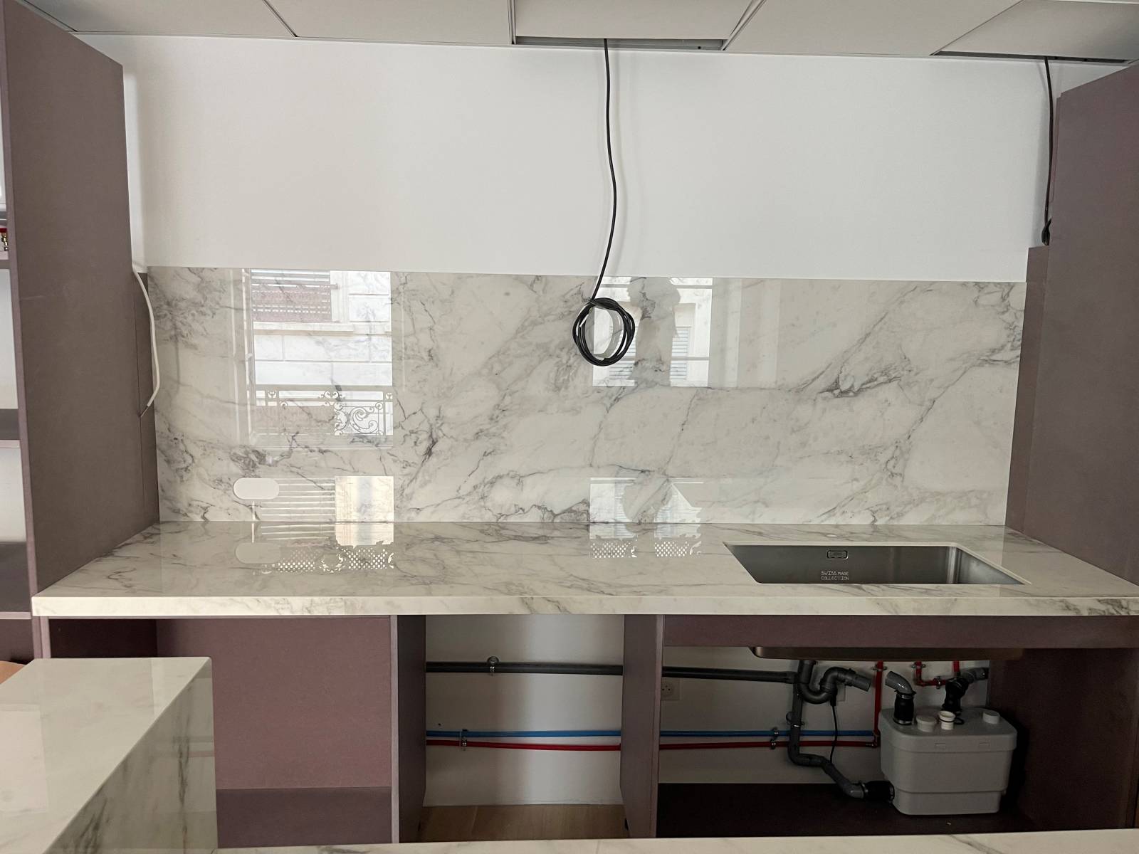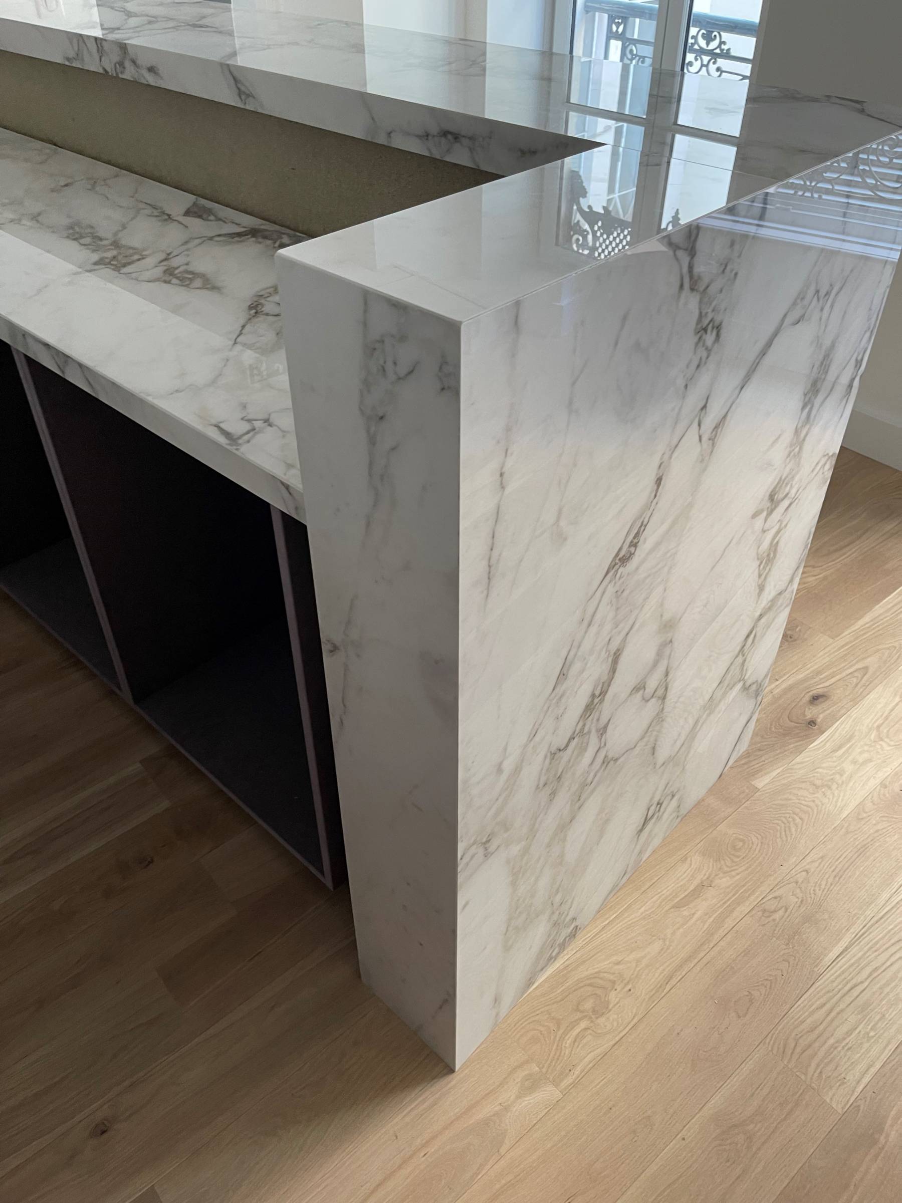 La matière choisie est la céramique de chez Marazzi dans la gamme Grande Marble Look Calacatta Lux et en épaisseur 12mm.