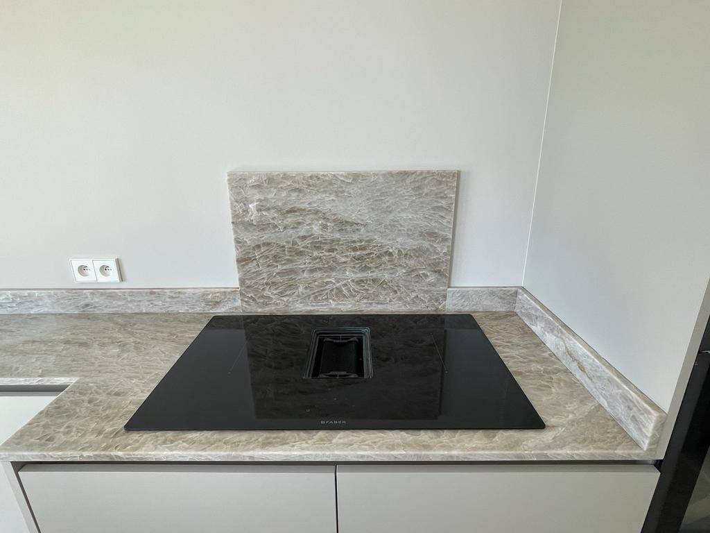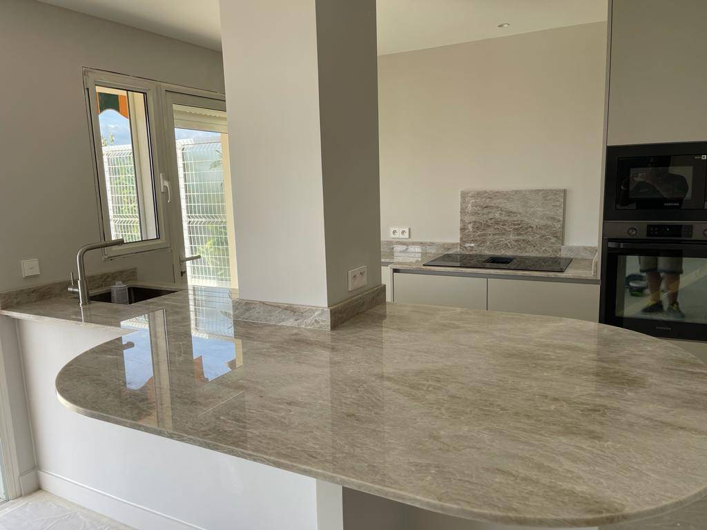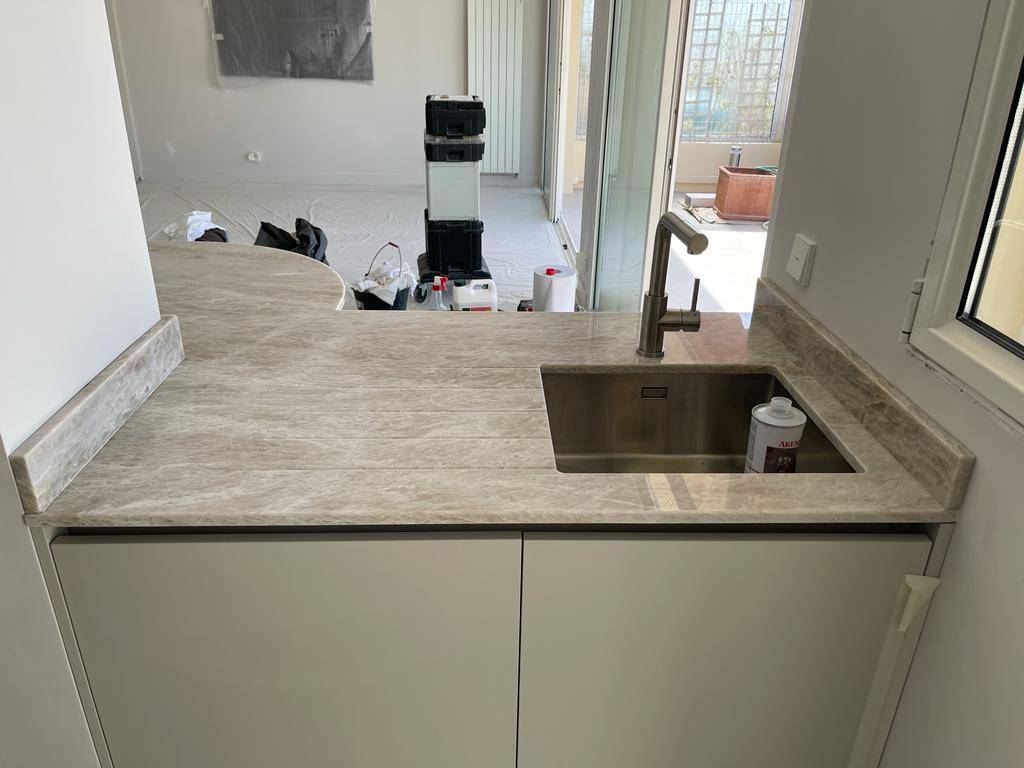 Installation de plan de travail pour une cuisine en granit Taj Mahal/Perla Venata à Cannes (06)