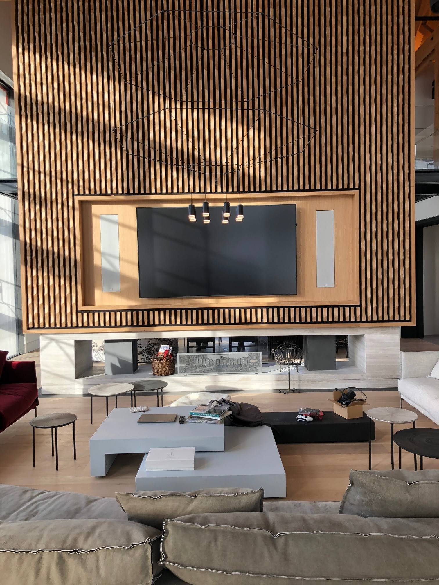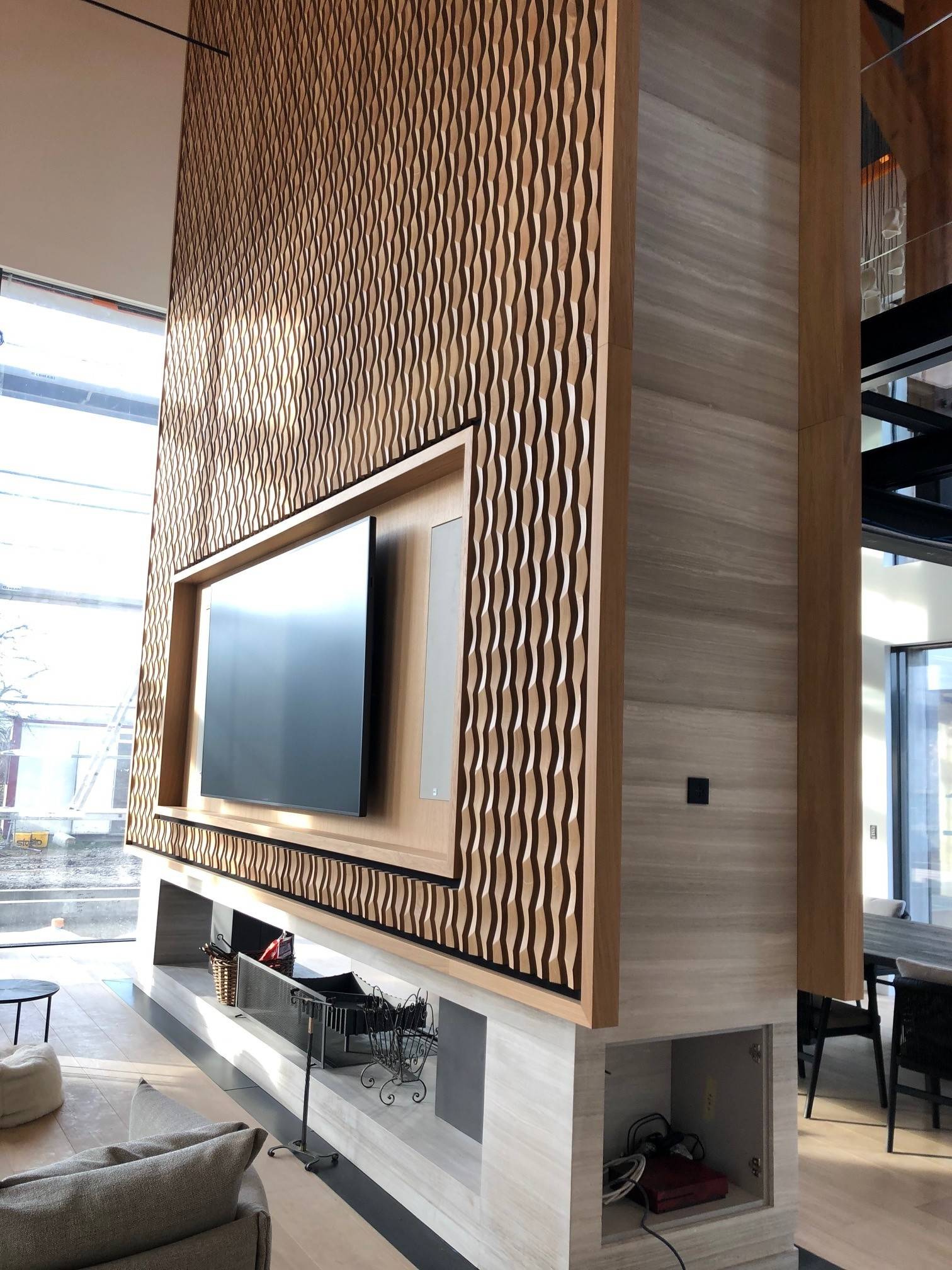 Un menuisier a réalisé le claustra en bois sur toute la hauteur de cette splendide cheminée toute hauteur.